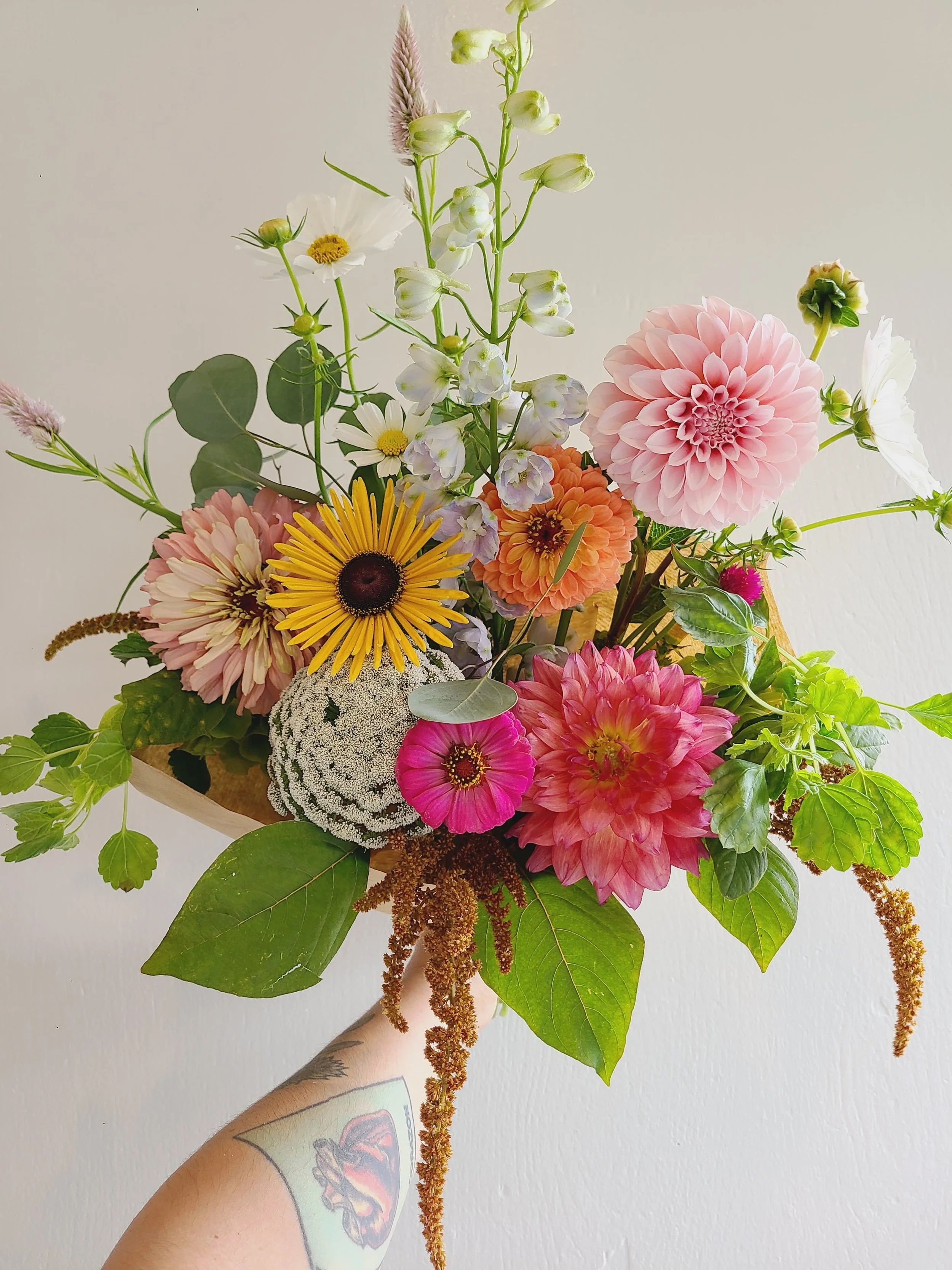 a special wrapped bouquet made with all locally grown blooms